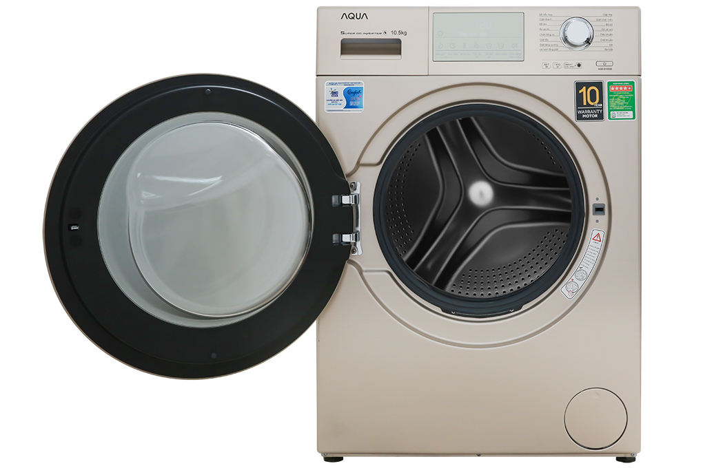 Máy giặt Aqua Inverter 10.5 kg AQD-D1050E N có kiểu dáng cửa trước hiện đại, sở hữu gam màu vàng kim sang trọng, đẳng cấp sẽ là điểm nhấn tuyệt vời cho không gian nội thất nhà bạn.