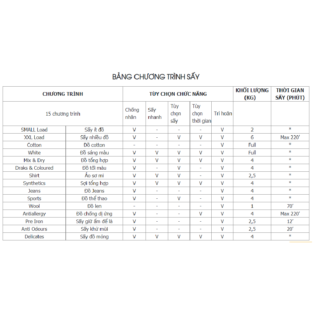 – Số chương trình sấy: 15 (cho tất cả chất liệu vải)