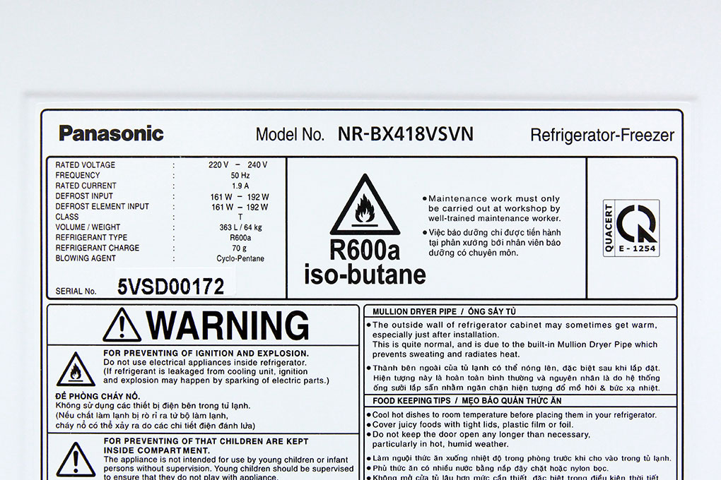 Tủ lạnh Panasonic Inverter 363 lít NR-BX418VSVN